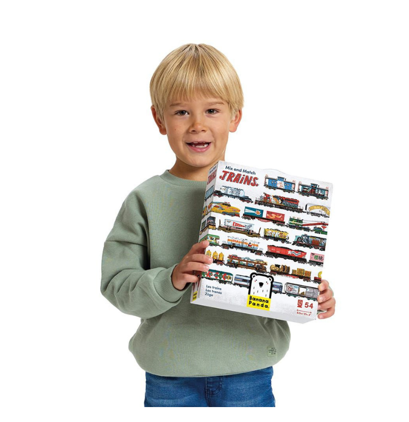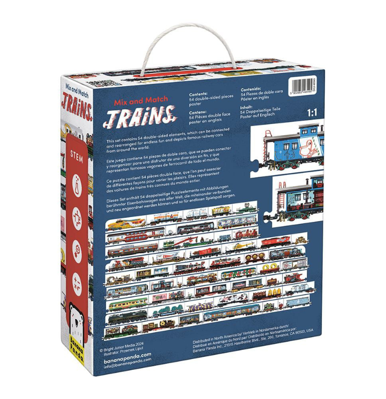 O Mix and Match Puzzle Trains é um puzzle criativo onde tudo é possível! Com peças de dupla face, as crianças podem misturar, combinar e construir comboios únicos até 6,5 metros. Cheio de detalhes e surpresas, estimula a imaginação, a lógica e o interesse pelo mundo dos transportes. Uma viagem divertida sem sair do lugar!