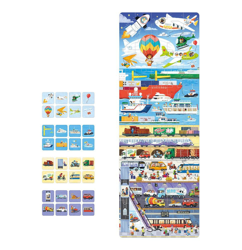 O puzzle não é apenas sobre encaixar peças — é uma experiência multidimensional que incentiva a criatividade. As crianças podem procurar elementos específicos na ilustração, posicionar as peças nos locais certos e até jogar contra o tempo, tornando a aprendizagem interativa e estimulante. Ao nomear os veículos, aprender curiosidades e explorar diferentes formas de transporte, ampliam o vocabulário e ganham conhecimento sobre o mundo à sua volta.