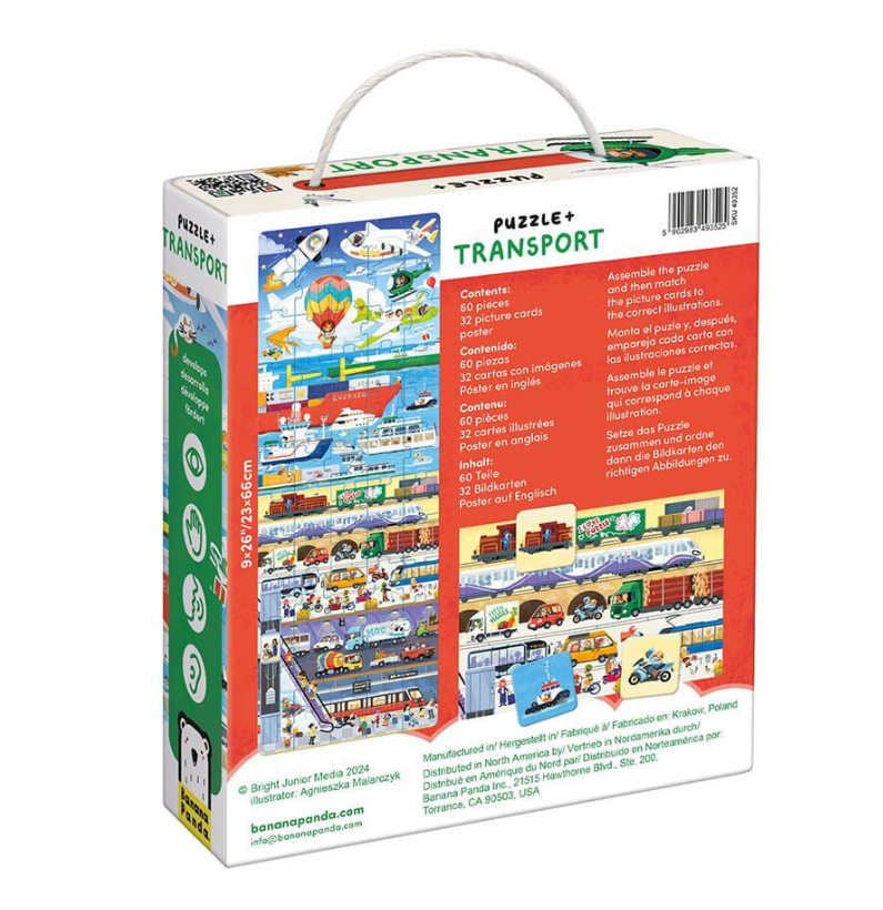 O Banana Panda Puzzle + Transport leva os mais pequenos a explorar o mundo sobre rodas, asas e água! Com 60 peças, 32 extras e um cartaz educativo, descubram carros, comboios, aviões e barcos enquanto desenvolvem motricidade, atenção e imaginação. Uma brincadeira divertida e educativa que transforma cada montagem numa verdadeira aventura de transportes!