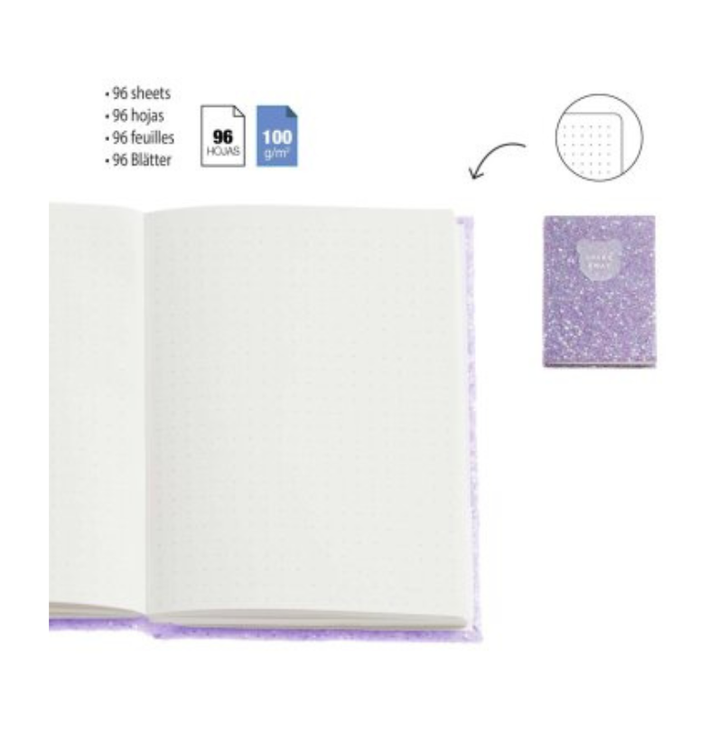 O Bloco Glitter Lilás Miquelrius Back2Fun Keep it Shiny é a combinação perfeita entre elegância, criatividade e funcionalidade. Com uma capa lilás brilhante e cheia de personalidade, este caderno destaca-se pelo seu acabamento glitter moderno, ideal para quem gosta de materiais de papelaria que inspiram e se fazem notar. A tonalidade suave, aliada ao brilho subtil, confere-lhe um visual atual e sofisticado, perfeito para diferentes estilos e idades.