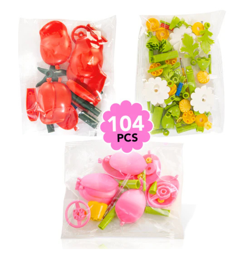 Inclui tudo o que precisas para criar o teu próprio bouquet: 104 peças, 3 reservatórios de tinta e guia de montagem. Perfeito para crianças 6+ que adoram criatividade e DIY!