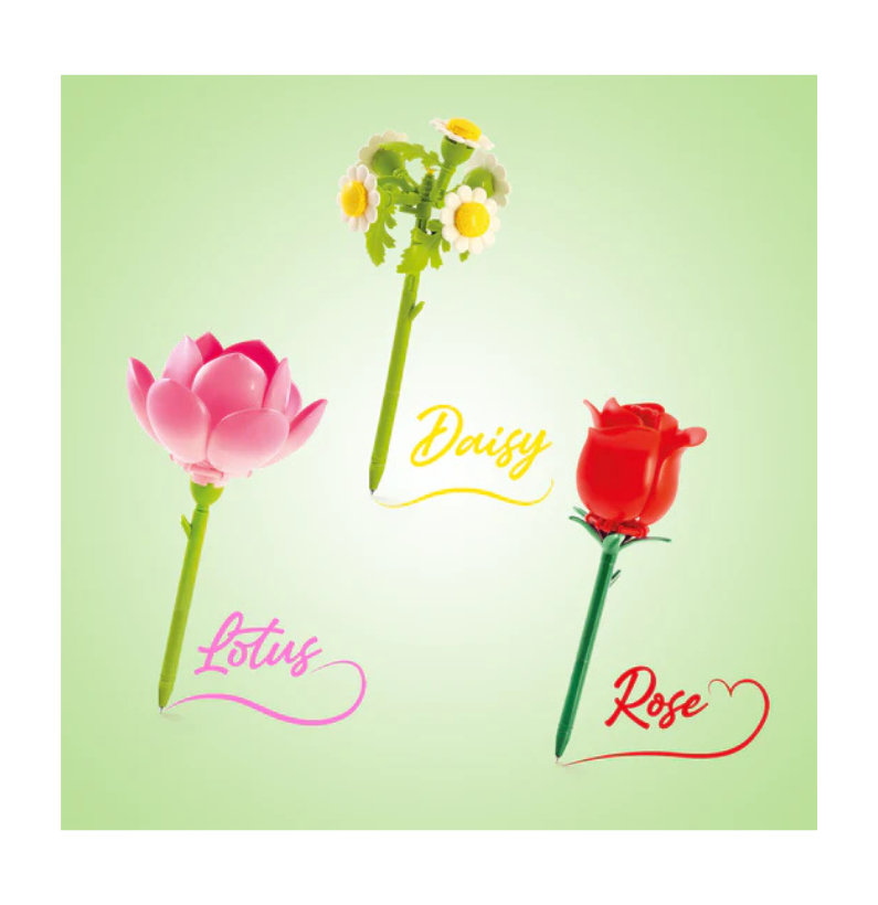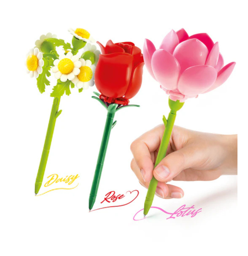 Um kit original que te permite montar 3 canetas em forma de flores: rosa, lótus e margarida.