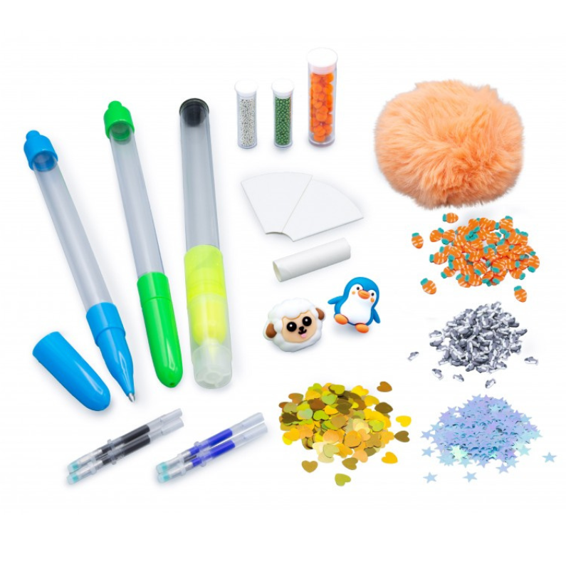 O kit inclui 2 canetas de tinta apagável e 1 marcador de texto, permitindo criar acessórios únicos que podem ser usados para escrever, desenhar e brincar. O grande destaque deste conjunto é a possibilidade de encher as canetas e o marcador de texto com várias decorações, como mini-miçangas, lantejoulas, pompons e estatuetas, tornando cada peça totalmente personalizada e original. As crianças podem soltar a sua criatividade e inventar combinações únicas, criando artigos de papelaria que refletem o seu gosto e personalidade.