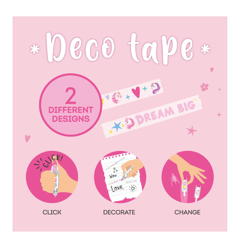 Com designs de unicórnio, 4 metros de fita decorativa e ponta retrátil, é perfeita para personalizares agendas, cadernos e muito mais. Inclui 2 recargas com padrões diferentes.