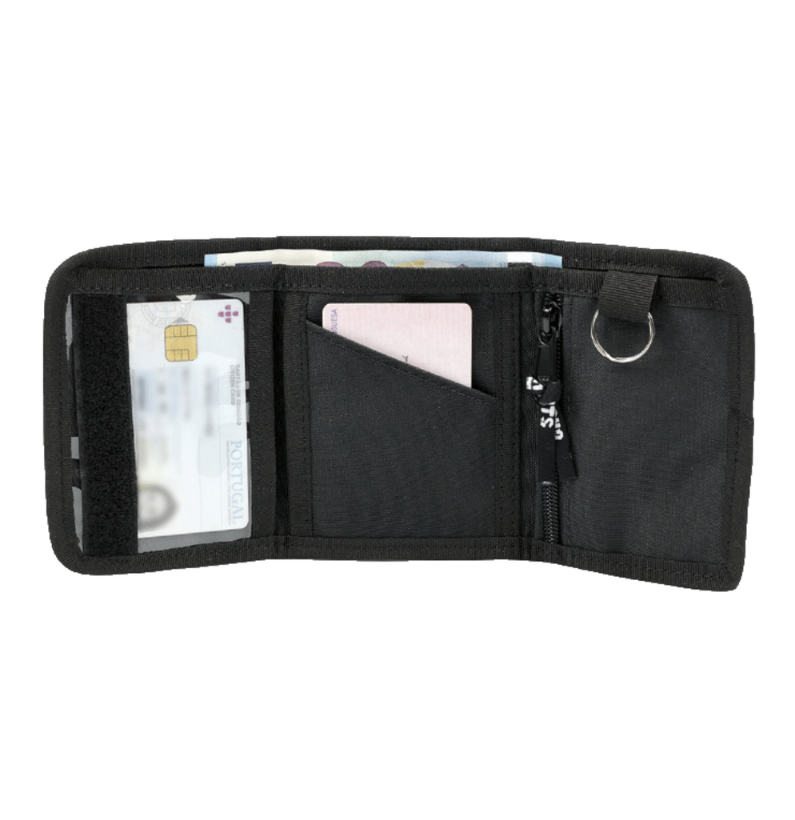 Inclui ainda um porta-moedas com fecho, ideal para guardar moedas em segurança sem o risco de se espalharem. Ao lado, o compartimento para notas permite guardar dinheiro em papel de forma organizada e sem dobras, sendo também útil para recibos ou pequenos documentos.