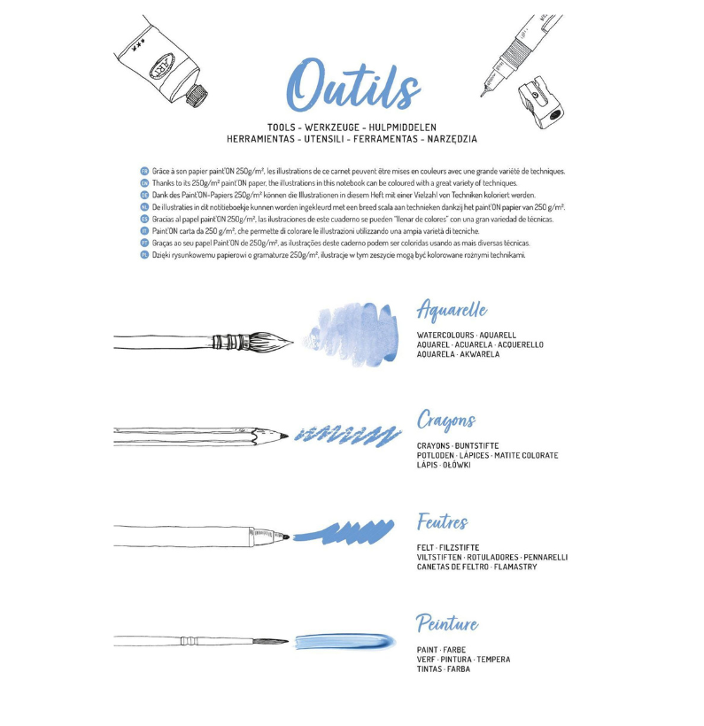 O conjunto oferece ainda uma folha introdutória com diversas técnicas de coloração, ajudando a orientar o utilizador na escolha de materiais e métodos, assim como uma folha de inspiração, pensada para desbloquear ideias e servir de guia na execução dos projetos.