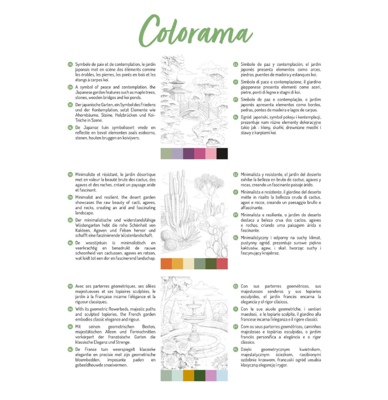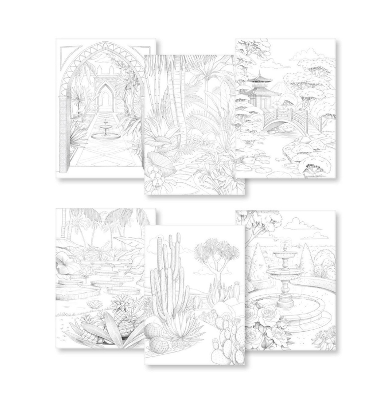 O bloco inclui seis ilustrações exclusivas com temática de jardins, cada uma repetida três vezes, oferecendo a oportunidade de experimentar diferentes combinações cromáticas, estilos e técnicas na mesma imagem. Esta característica é perfeita para quem deseja testar abordagens distintas, aperfeiçoar métodos ou simplesmente explorar a criatividade sem receio de errar. A repetição dos motivos permite comparar resultados e acompanhar a evolução artística ao longo do tempo.