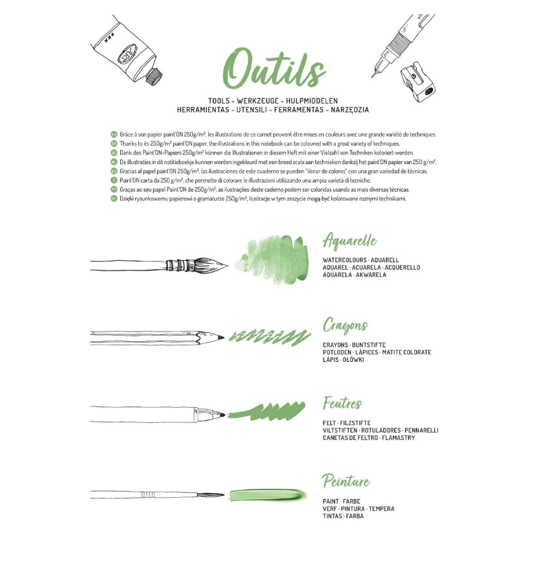 Para enriquecer a experiência criativa, o conjunto integra uma folha introdutória com explicação de diversas técnicas de pintura, ajudando a tirar o máximo partido dos materiais utilizados. Inclui ainda uma folha de inspiração, pensada para estimular ideias e orientar os primeiros passos em cada composição.
