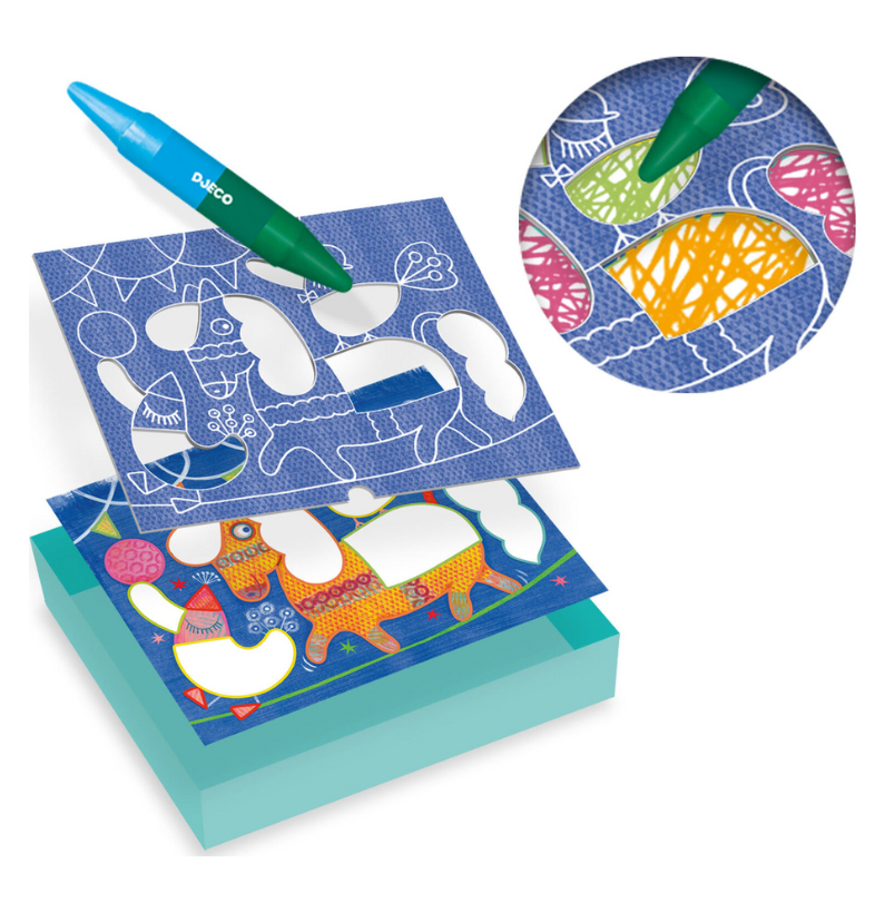 O kit vem com três lápis de cera grossos de ponta dupla, fazendo assim seis cores vibrantes para escolher. Os lápis são fáceis de segurar por mãos pequenas e estimulam o desenvolvimento da coordenação motora fina, enquanto as crianças exploram formas, traços e combinações de cores. Os stencils ajudam a guiar o traçado, mas sem limitar a imaginação — permitindo que cada desenho seja único.