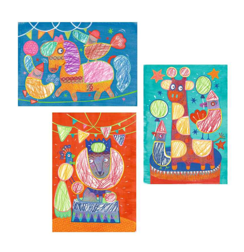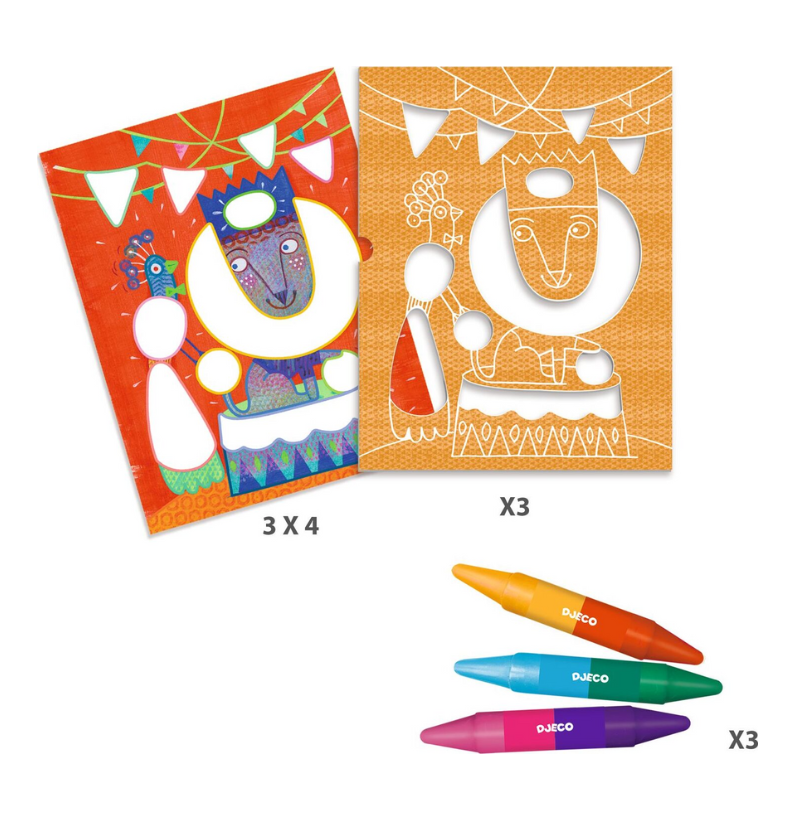 - Conteúdo: 12 cartões ilustrados (21 x 28 cm), 3 stencils grossos ilustrados, 3 lápis de cera com ponta dupla e 1 livro de instruções passo a passo.