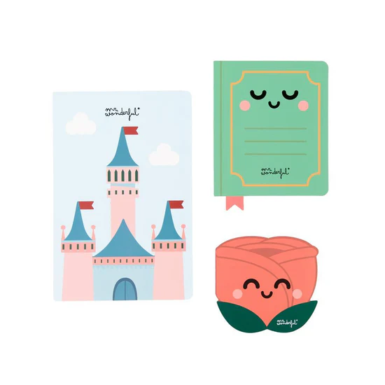 Conj. 3 cadernos/bloco de notas – Castelo, Livro e Rosa Mr. Wonderful
