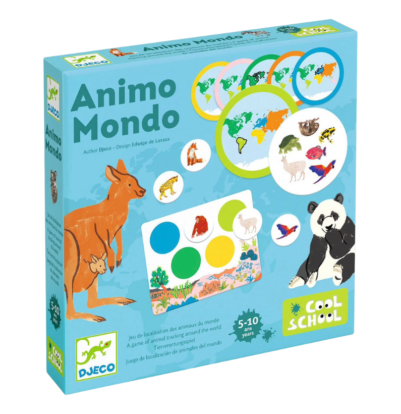 O Djeco Animo Mondo é um jogo educativo e divertido que leva as crianças a descobrir os habitats naturais de animais de todo o mundo. Nesta aventura, o panda, o canguru, a lhama, o esquilo e muitos outros amigos perderam-se e precisam de ajuda para regressar a casa. Tal como num jogo de loto clássico, os jogadores devem identificar corretamente onde cada animal vive, associando-os aos continentes correspondentes. O primeiro a completar o seu tabuleiro vence, mas o mais importante é a diversão e a aprendizagem ao longo do caminho.