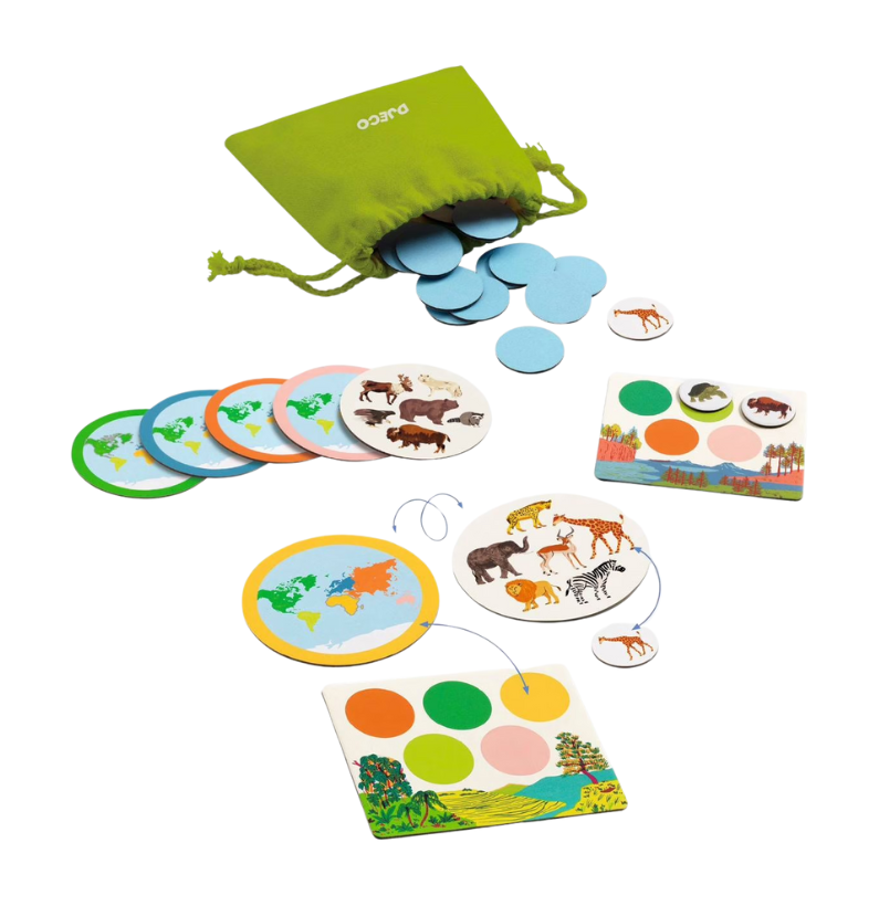 O Djeco Animo Mondo inclui 6 cartas redondas com os continentes, 6 cartões de loto, 42 fichas redondas com animais e uma prática bolsa em tecido para guardar todas as peças. As fichas são fáceis de manusear e suficientemente resistentes para suportar muitas horas de brincadeira, enquanto os cartões coloridos tornam a aprendizagem visualmente estimulante.