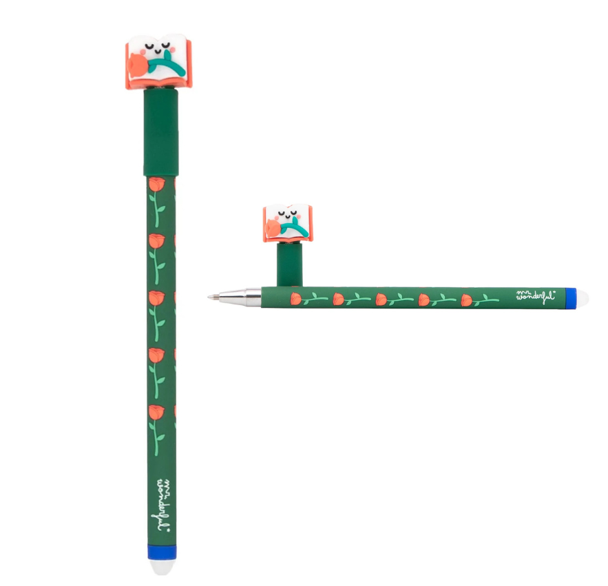 Caneta Apagável Bo-Bo com um personagem relacionado com o Dia do Livro na extremidade.