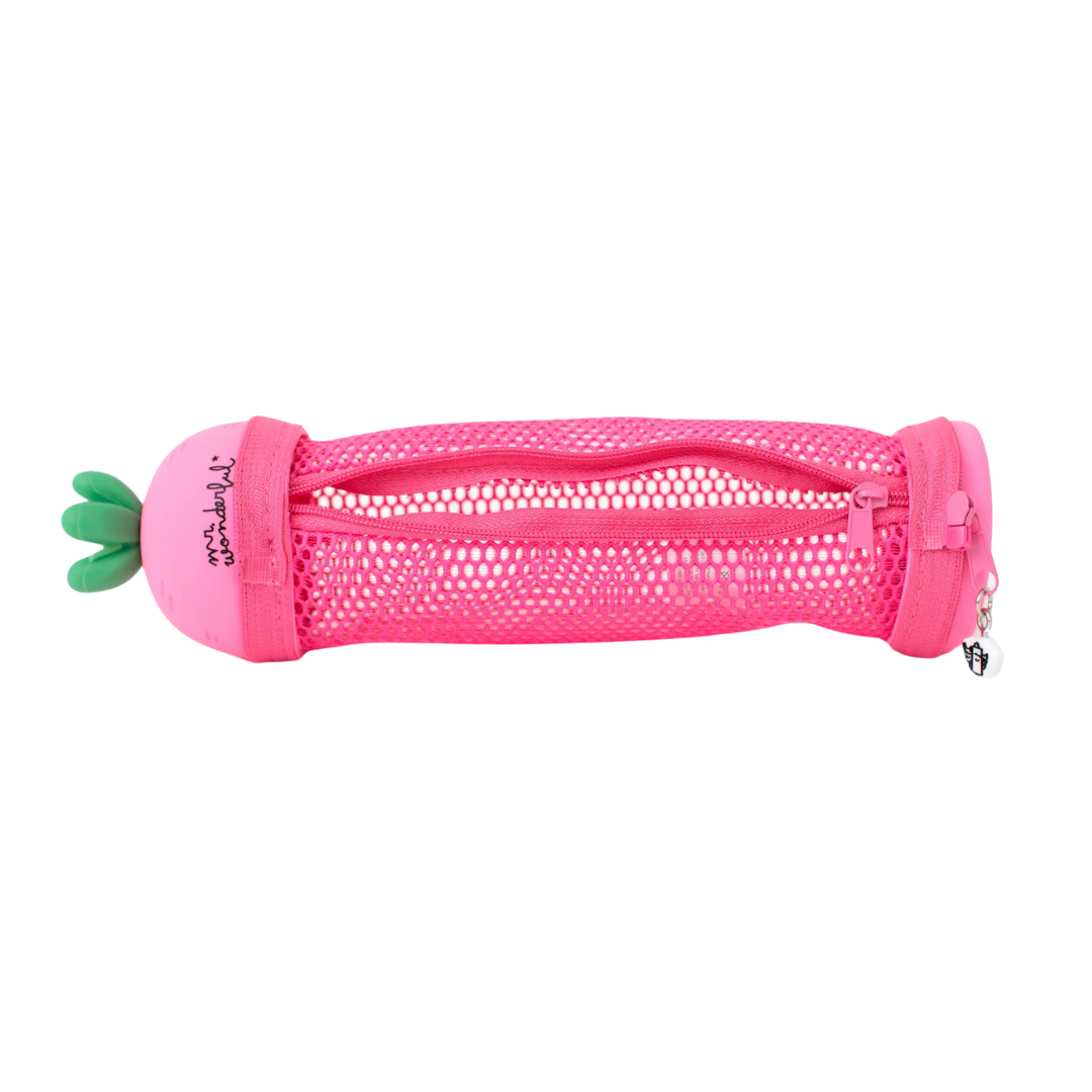 Feito em silicone suave, tem um fecho de correr que transforma o estojo num bonequinho superdivertido! A parte do meio é em malha de poliéster transparente — perfeita para veres todos os lápis, canetas e segredos coloridos lá dentro.