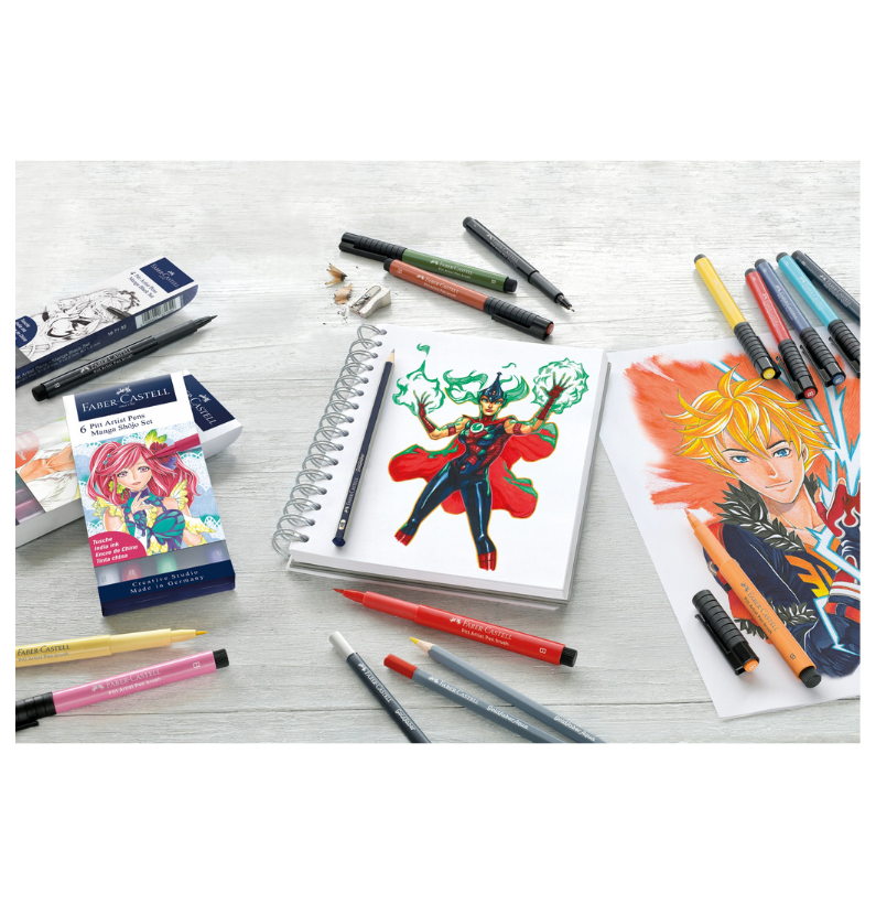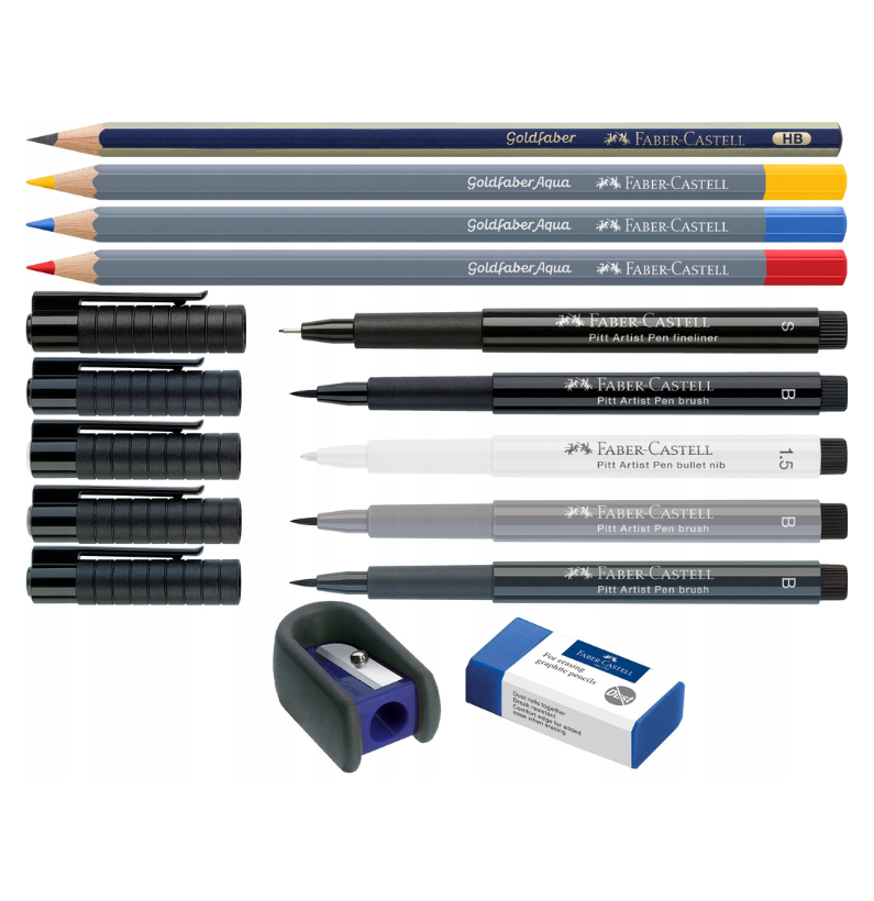 Desenvolvido com ilustradores de quadrinhos, este conjunto de 11 peças traz tudo para dar vida às tuas histórias: canetas Pitt Artist Pen, lápis aquareláveis Goldfaber Aqua, lápis grafite, apontador e borracha.