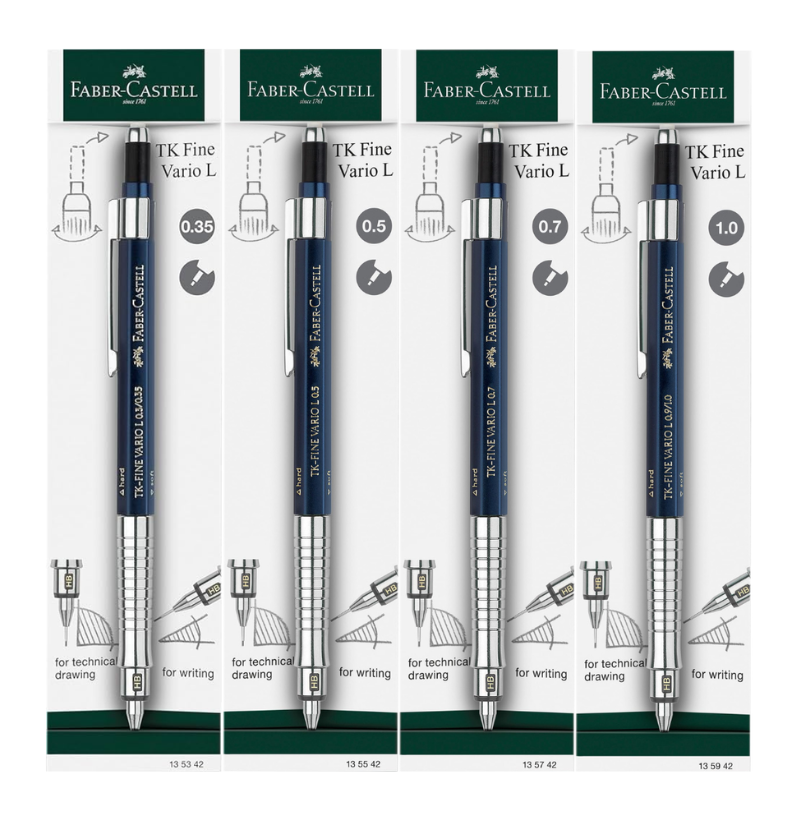 A lapiseira TK-Fine Vario L Índigo da Faber-Castell combina precisão e versatilidade num design elegante. Disponível em 4 espessuras (0,35 a 1,0 mm), adapta-se a qualquer tipo de traço.