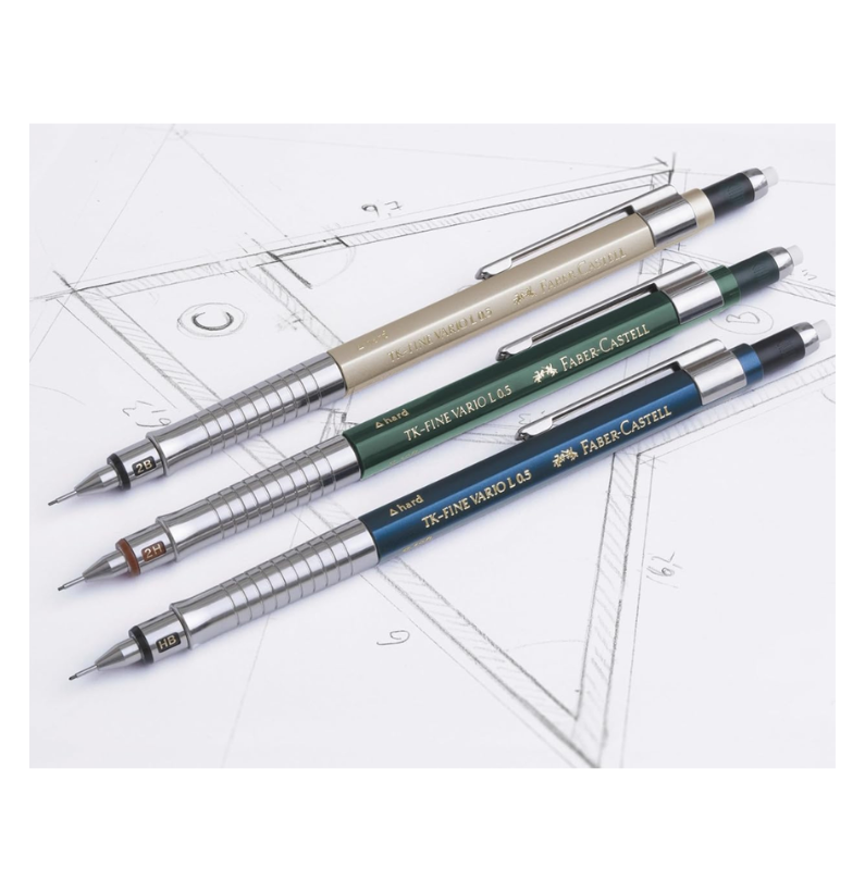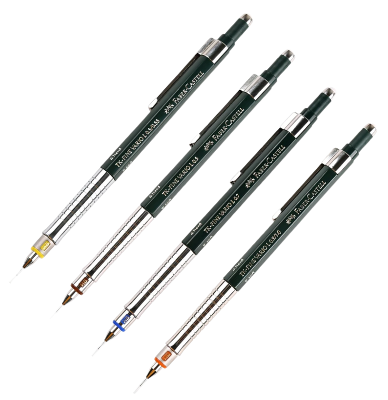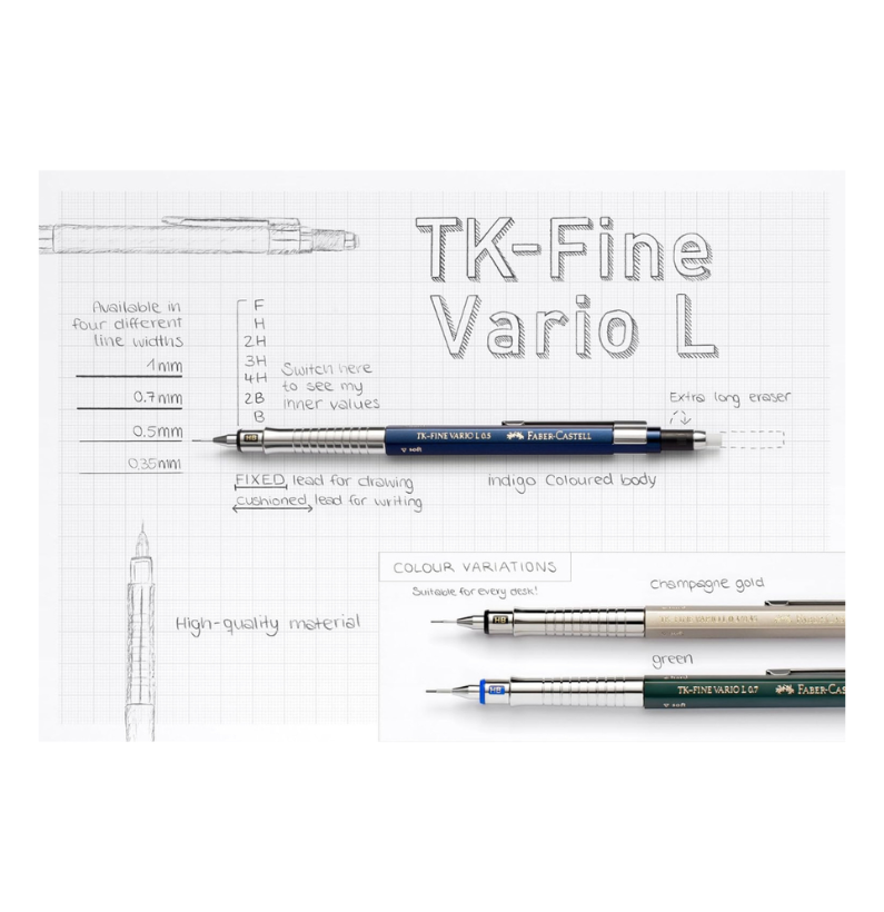 A lapiseira TK-Fine Vario L Verde da Faber-Castell combina precisão e versatilidade num design elegante. Disponível em 4 espessuras (0,35 a 1,0 mm), adapta-se a qualquer tipo de traço.