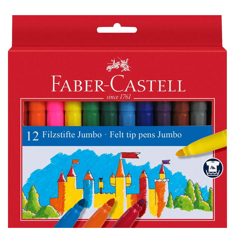 Os Faber-Castell Marcadores Jumbo 12 cores são perfeitos para jovens artistas! Com pontas de fibra resistentes para traços largos ou finos, formato hexagonal ergonómico e cores vibrantes, tornam cada desenho divertido e preciso. Sai facilmente na lavagem da maioria dos tecidos e vem num estojo prático com 12 unidades, ideal para colorir, criar e explorar a criatividade sem limites!