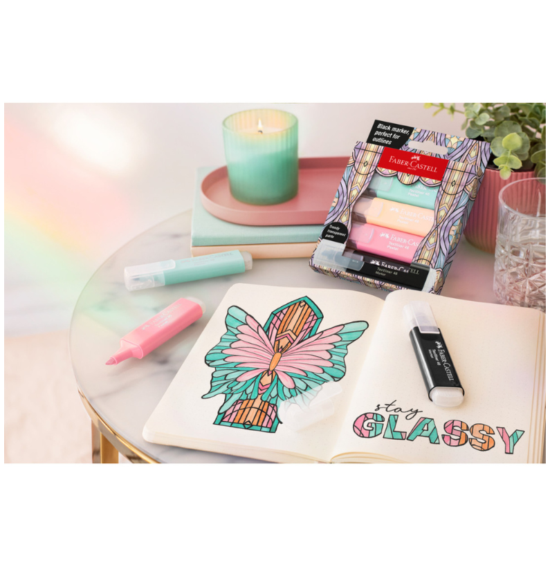 O conjunto Marcadores Textliner Glassy Pastel c/4 inclui o reconhecido Textliner 46 Glassy Pastel da Faber-Castell (ref. 254694), desenvolvido para proporcionar marcações suaves, elegantes e visualmente harmoniosas. Com tonalidades pastel brilhantes e translúcidas, estes marcadores são ideais para quem procura realçar informação de forma subtil, sem comprometer a legibilidade do texto original. A sua estética delicada adapta-se perfeitamente a contextos criativos e académicos, tornando-os uma excelente escolha para bullet journaling, estudo diário, organização de apontamentos ou trabalhos de caligrafia.