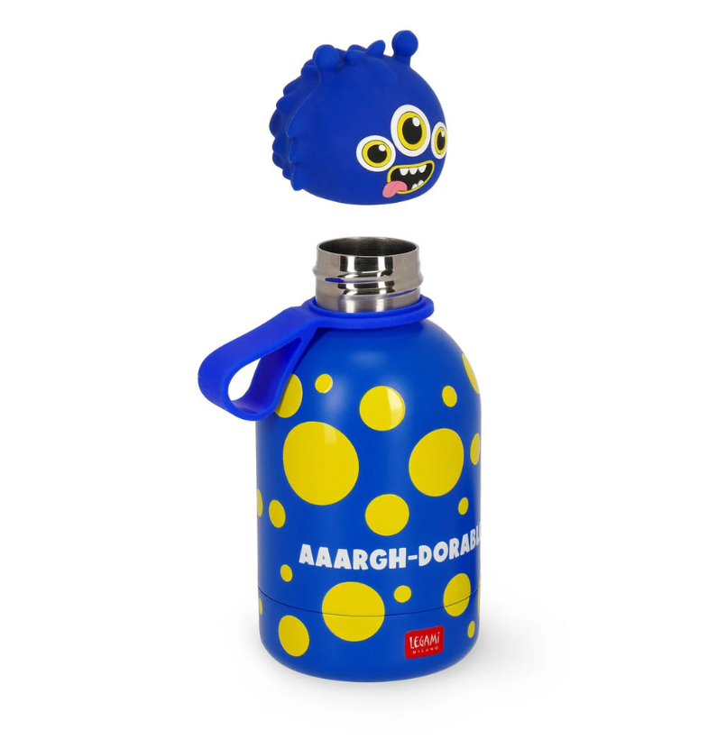 A Garrafa Térmica Infantil Legami – Monster mantém bebidas quentes até 12h e frias até 24h.