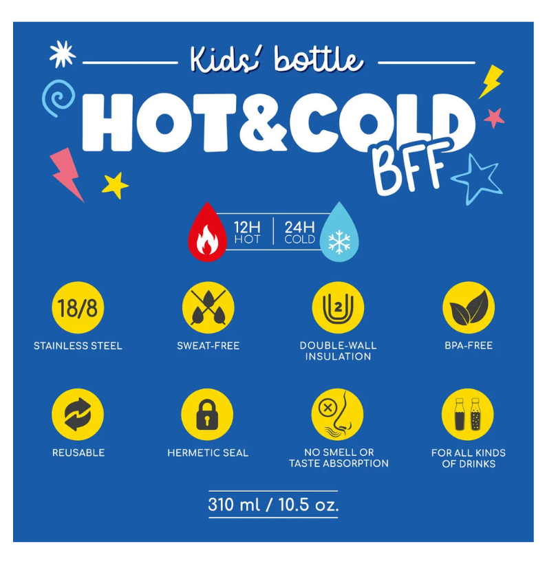 Graças à sua tecnologia de isolamento a vácuo, esta garrafa é perfeita tanto para bebidas quentes como frias: mantém líquidos quentes até 12 horas e frios até 24 horas, garantindo sempre a temperatura ideal. Seja um chá quente no inverno ou uma água fresca no verão, a Garrafa Monster está sempre pronta para acompanhar o dia dos mais pequenos.