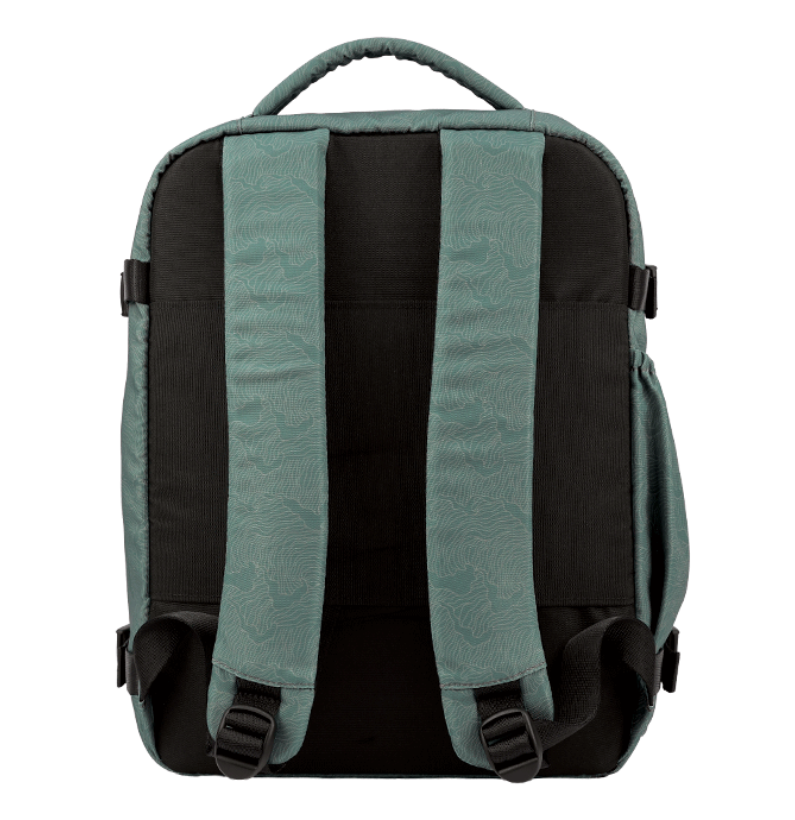 No exterior, a mochila oferece uma bolsa lateral prática para transportar pequenos objetos ou uma garrafa de água, garantindo fácil acesso sempre que precisares. As costas acolchoadas e as alças ergonómicas foram desenhadas para proporcionar máximo conforto, mesmo quando a mochila está totalmente cheia. Além disso, inclui um sistema de fixação para trolley, permitindo acoplá-la facilmente a uma mala de viagem com rodas (não incluída), o que facilita a mobilidade em aeroportos e estações.