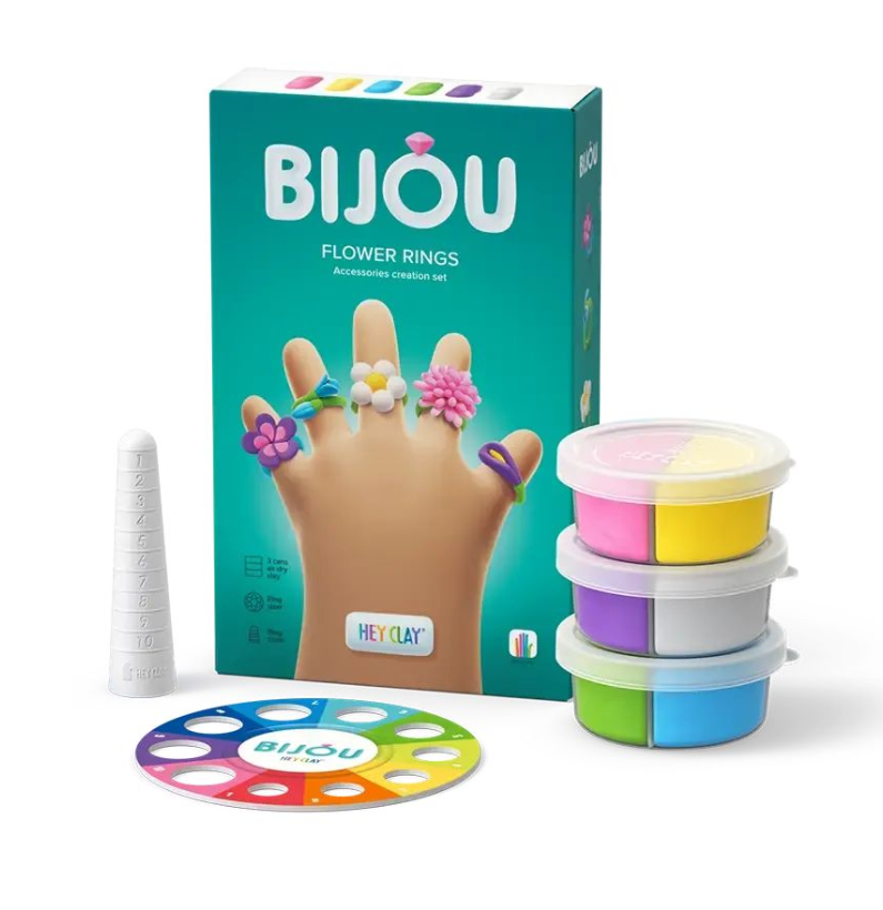 Descubra o Hey Clay Bijou Flower Rings, um divertido conjunto de argila colorida para modelar que seca ao ar, ideal para crianças a partir dos 3 anos. Com 3 potes de argila e uma aplicação interativa, os mais pequenos podem criar lindos anéis em forma de flores, cheios de cor, criatividade e imaginação.