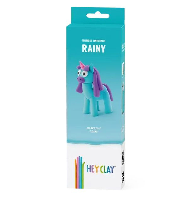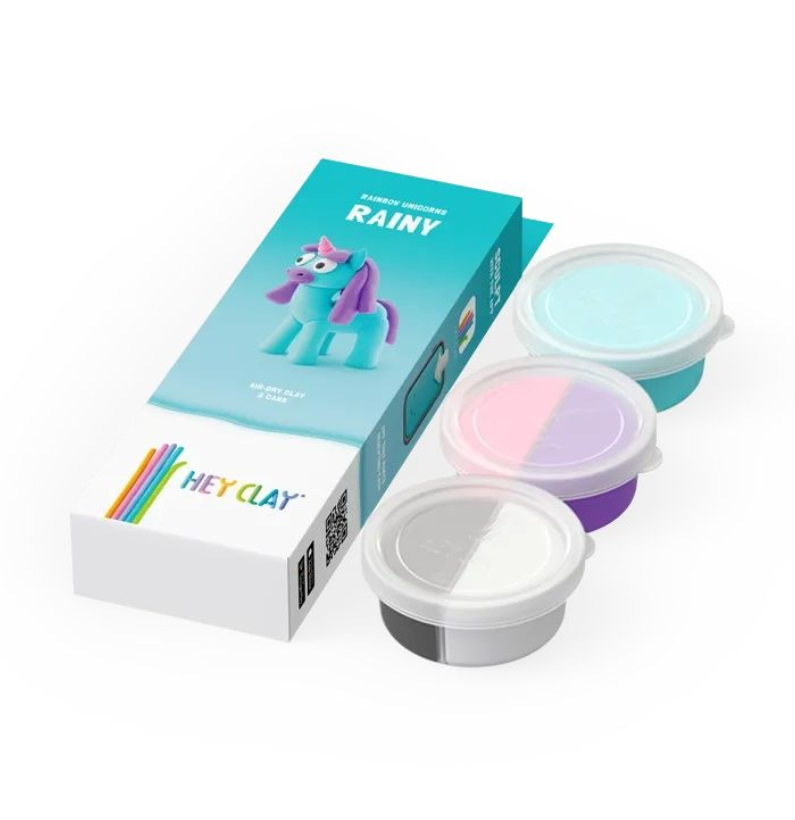 Descubra o Hey Clay Rainbow Unicorns Rainy, um conjunto mágico de argila colorida que seca ao ar, ideal para crianças a partir dos 3 anos. Com 3 latas de argila e uma aplicação interativa, os mais pequenos podem criar unicórnios arco-íris cheios de cor e brilho.