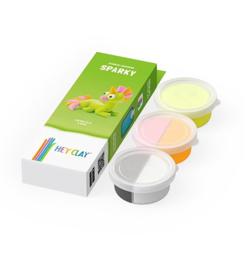 Descubra o Hey Clay Rainbow Unicorns Sparky, um conjunto mágico de argila colorida que seca ao ar, ideal para crianças a partir dos 3 anos. Com 3 latas de argila e uma aplicação interativa, os pequenos podem criar unicórnios arco-íris cheios de cor, brilho e personalidade.