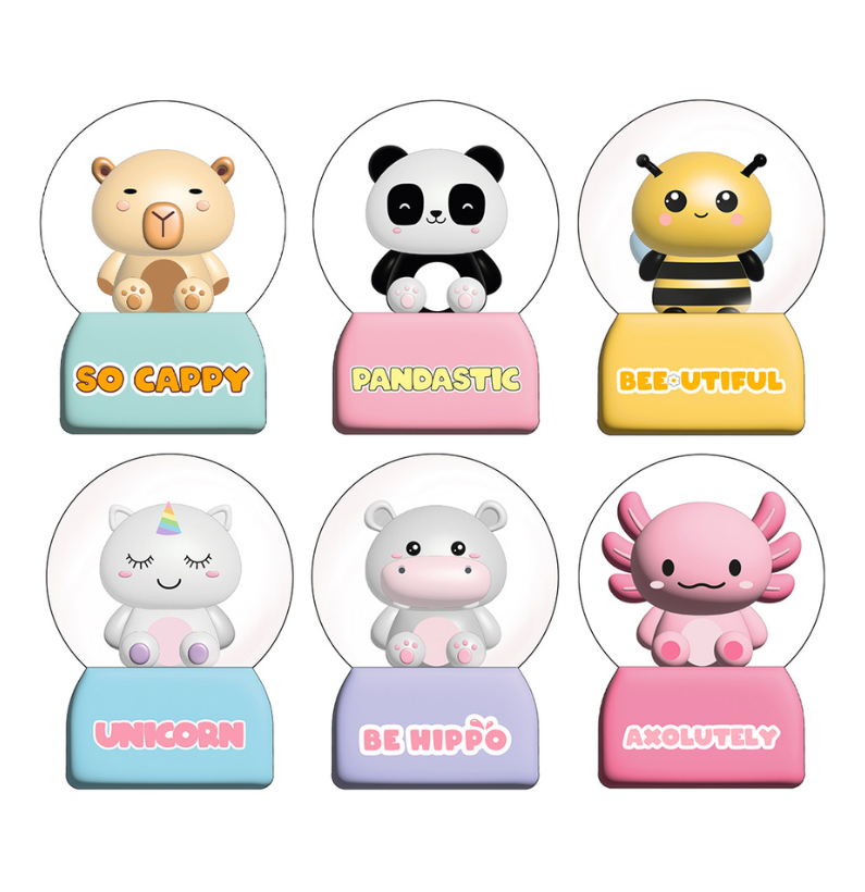 | Figuras | Abelha, Axolutely, Capivara, Hipopotamo, Panda, Unicórnio |