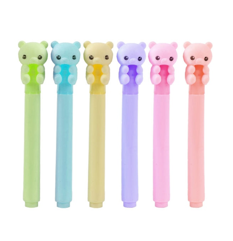 Compactos e práticos, cada marcador tem uma tampa em forma de ursinho e cores pastel encantadoras. Perfeitos para a escola, escritório ou casa, destacam textos de forma clara e organizada, sem borrar. Leves e fáceis de transportar, tornam o estudo ou o trabalho mais divertido e colorido. Um conjunto de 6 cores sortidas que combina utilidade e charme num só acessório.