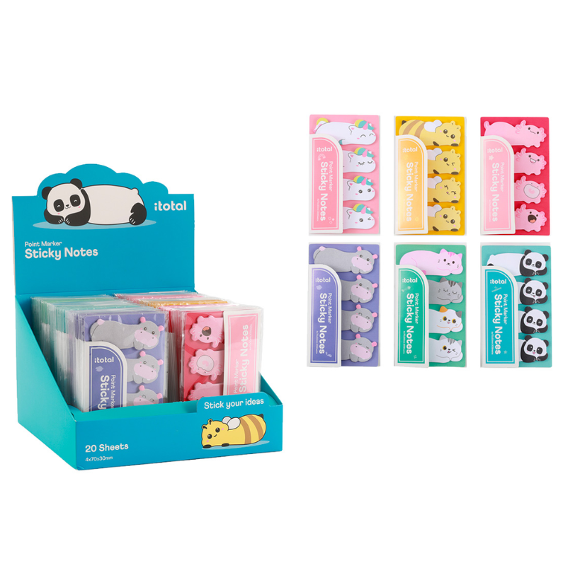 Organiza o teu dia com um toque de criatividade e boa disposição com as iTotal Sticky Notes Point Marker em temas sortidos! Este conjunto encantador traz uma seleção de blocos adesivos inspirados em personagens irresistíveis como o axolote (“axolutely” adorável), panda, gatos, abelha, hipopótamo e unicórnio — cada um com um design único, divertido e cheio de personalidade.