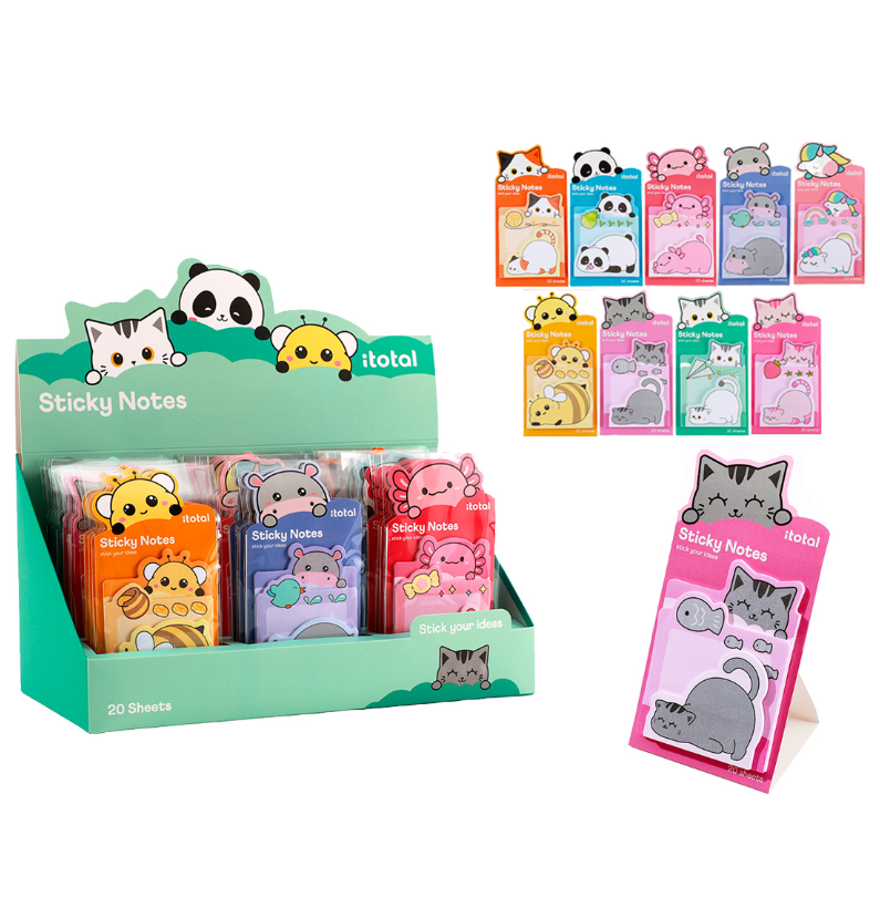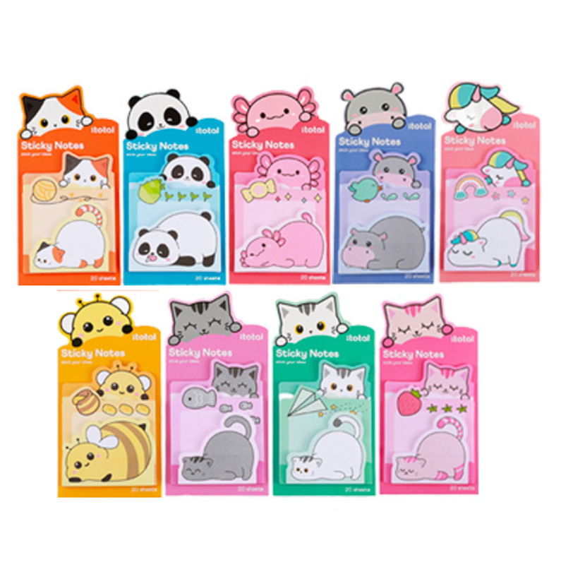 Organiza o teu dia com um toque de criatividade e boa disposição com as iTotal Sticky Notes em temas sortidos! Este conjunto encantador traz uma seleção de blocos adesivos inspirados em personagens irresistíveis como o axolote (“axolutely” adorável), panda, gatos, abelha, hipopótamo e unicórnio — cada um com um design único, divertido e cheio de personalidade.