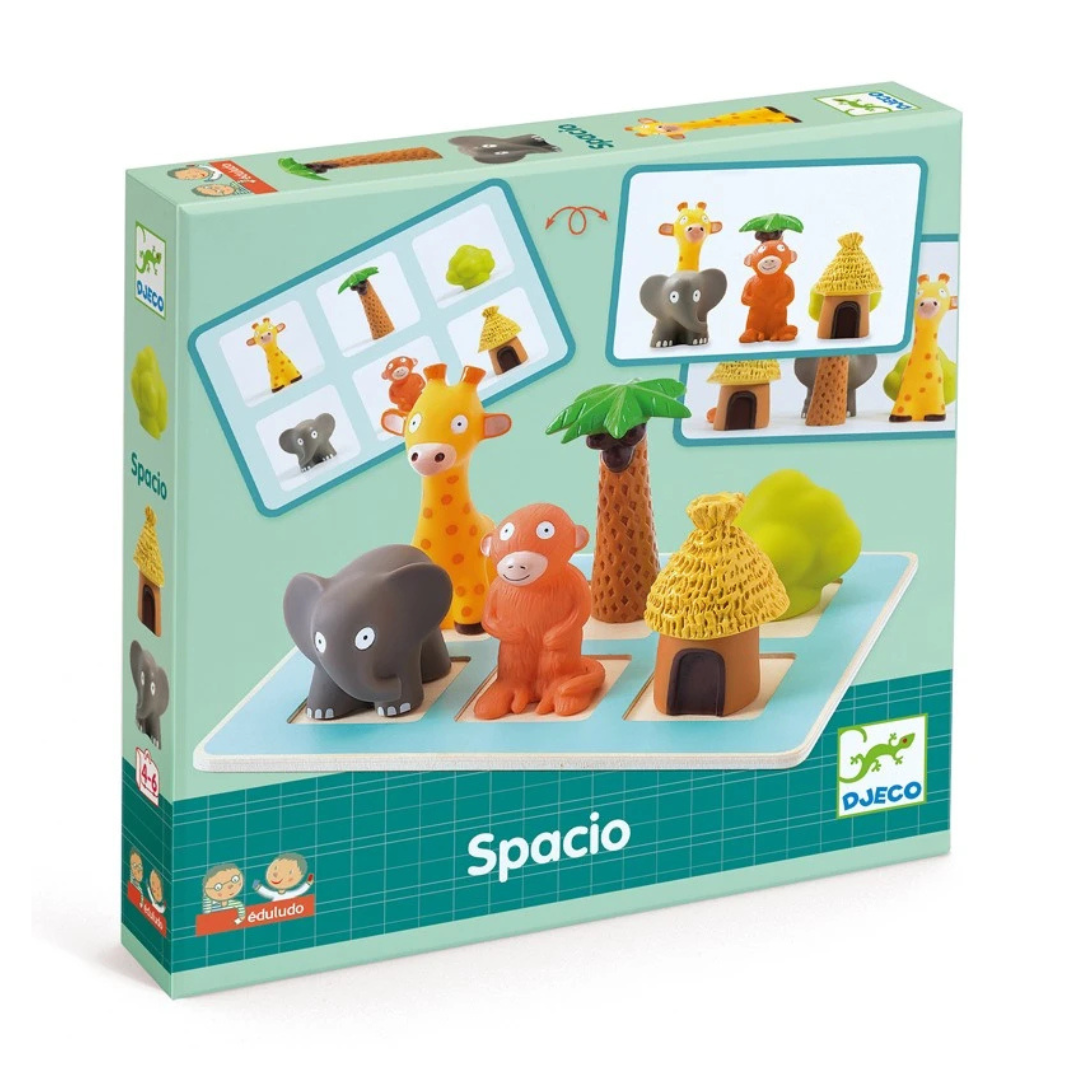 Um jogo divertido e simples da coleção Eduludo para ensinar as crianças sobre relações espaciais, onde elas devem posicionar corretamente as figuras no tabuleiro para reproduzir a imagem. Onde está a girafa?