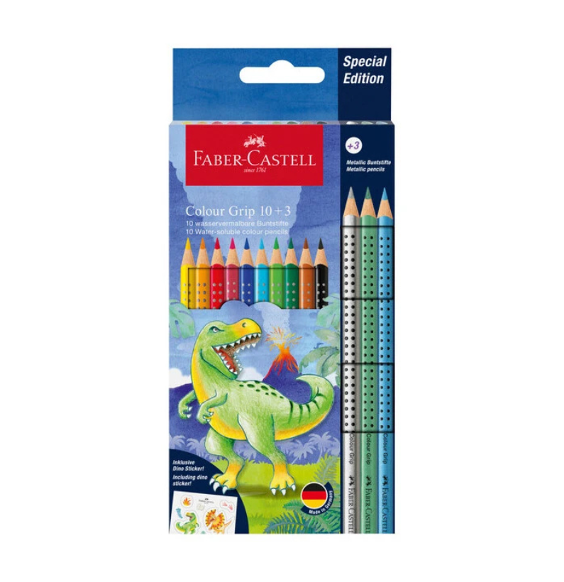 Os lápis coloridos Color Grip ,da Faber-Castell, edição especial dinossauro, apresentam um formato triangular ergonômico e uma zona de Soft-Grip patenteada. Isso garante um desenho confortável. A alta pigmentação no chumbo torna as cores muito vívidas. Os pigmentos solúveis em água dão resultados fantásticos: basta desenhar sua imagem e, em seguida, aplicar água em um pincel para criar belas imagens de aguarela.