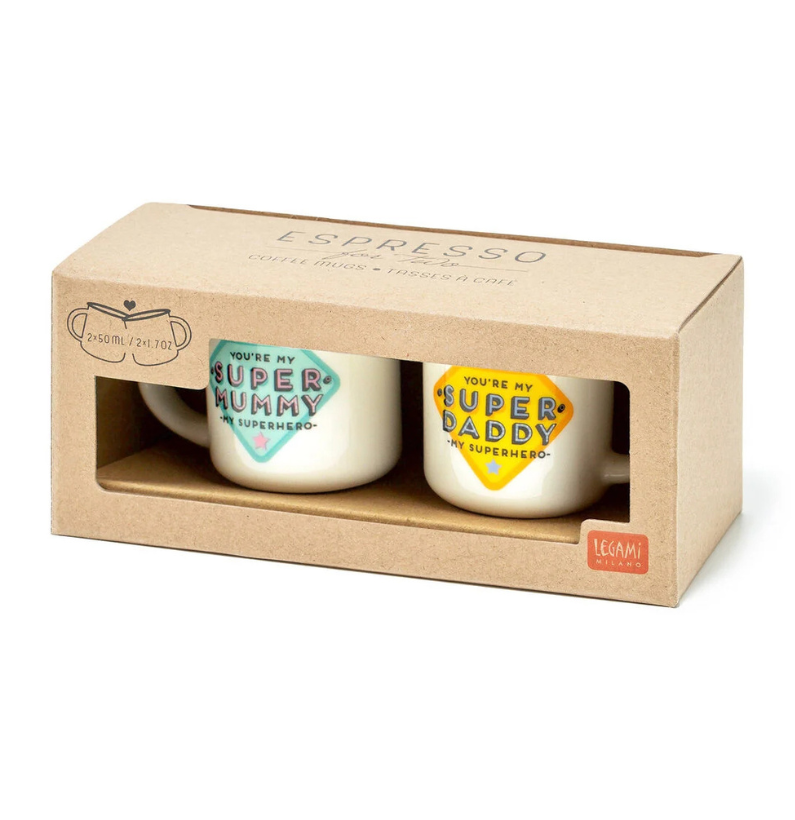 O conjunto de 2 Chávenas de Café Expresso For Two – Super Mummy e Super Daddy da Legami é a escolha perfeita para tornar os momentos de café ainda mais especiais e cheios de carinho. Porque o café sabe sempre melhor na companhia certa, estas chávenas em porcelana fina com tema de Mamãe e Papai trazem um toque de diversão e emoção à rotina diária, tornando cada pausa para um expresso numa experiência memorável. Ideais para surpreender os pais, estas chávenas tornam cada café um gesto de afeto e reconhecimento pelo cuidado e dedicação de quem está sempre presente.