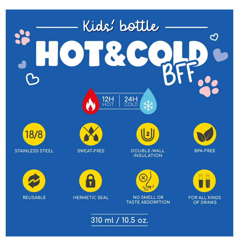A Garrafa Térmica Infantil Hot&Cold BFF – Kitty da Legami é a companheira perfeita para acompanhar os mais pequenos em todas as suas aventuras. Porque o mundo reserva descobertas incríveis todos os dias, nada melhor do que manter a hidratação de forma prática, segura e divertida. Com um adorável tema de gatinho, esta garrafa térmica transforma cada gole num momento especial, incentivando as crianças a beber água ao longo do dia.