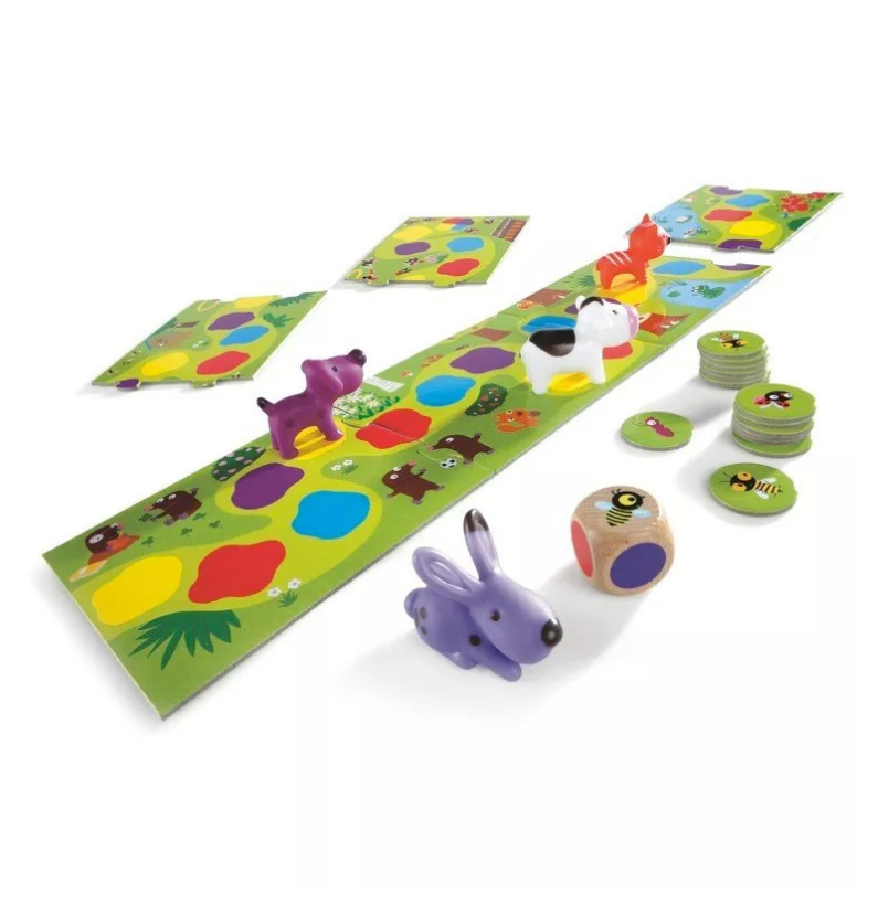 Um jogo de percurso para aprender a lançar dados e a deslocação na pista com ajuda de cores. Pequenos animais passeiam num caminho. O dado indica o vermelho: o cãozinho pode avançar até à próxima casa vermelha… Quem vai chegar primeiro ao fim do caminho?