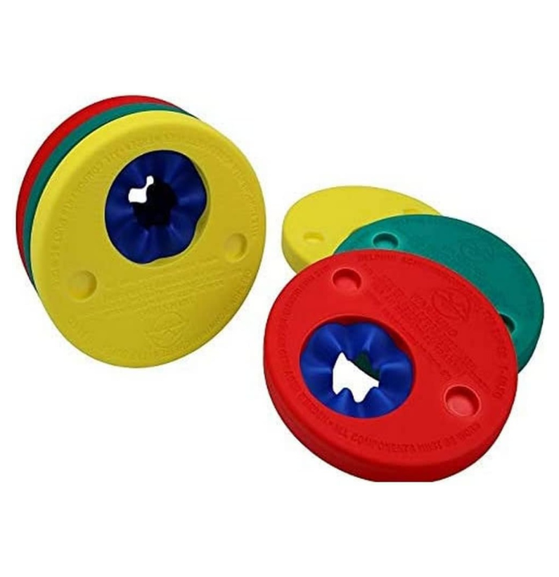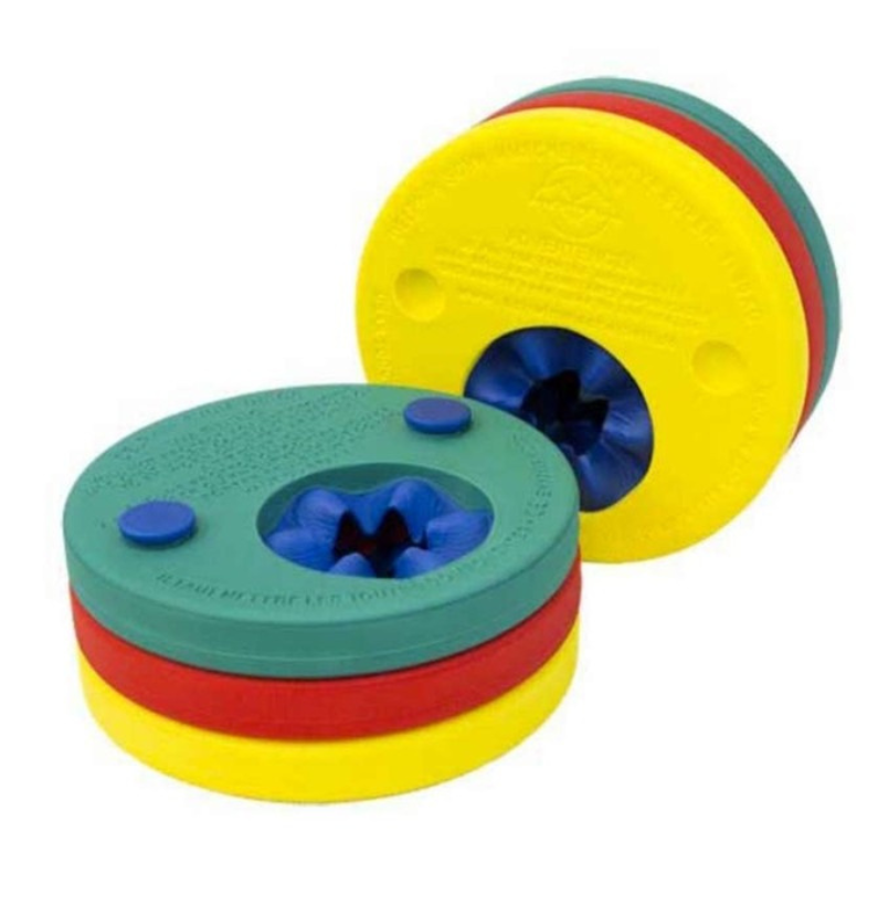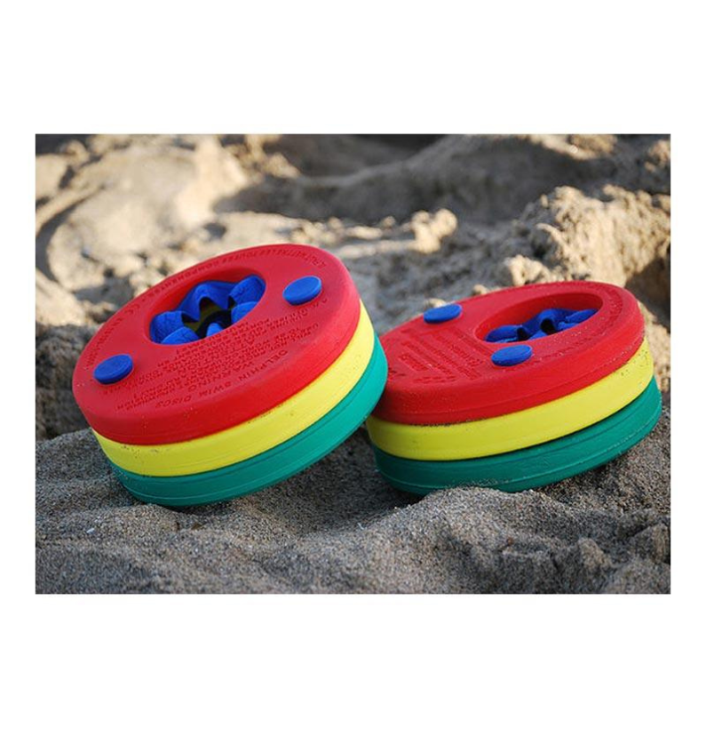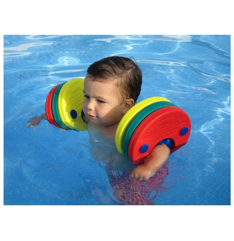 Cada conjunto é formado por 6 discos coloridos, 3 para cada braço, que podem ser retirados à medida que a criança ganha confiança e habilidade na água. No início, recomenda-se utilizar o conjunto completo, garantindo maior flutuação e estabilidade. Esta abordagem evolutiva permite que o equipamento cresça com a criança, adaptando-se às suas necessidades e promovendo uma aprendizagem gradual e segura.