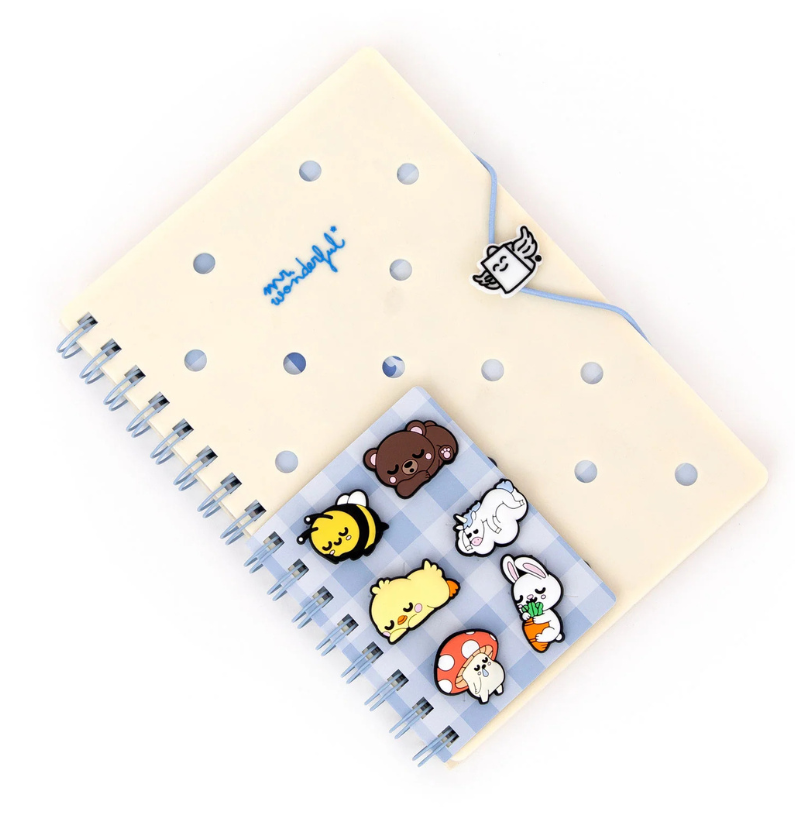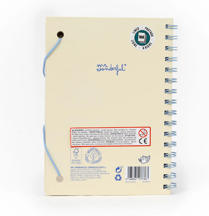 Dá um toque de diversão aos teus apontamentos com o Mr. Wonderful Caderno A5 com Pingentes Lazy Bo-Bo! Com encadernação em espiral, 80 folhas pautadas de alta qualidade e certificação FSC, é perfeito para escrever, organizar e criar sem limites.