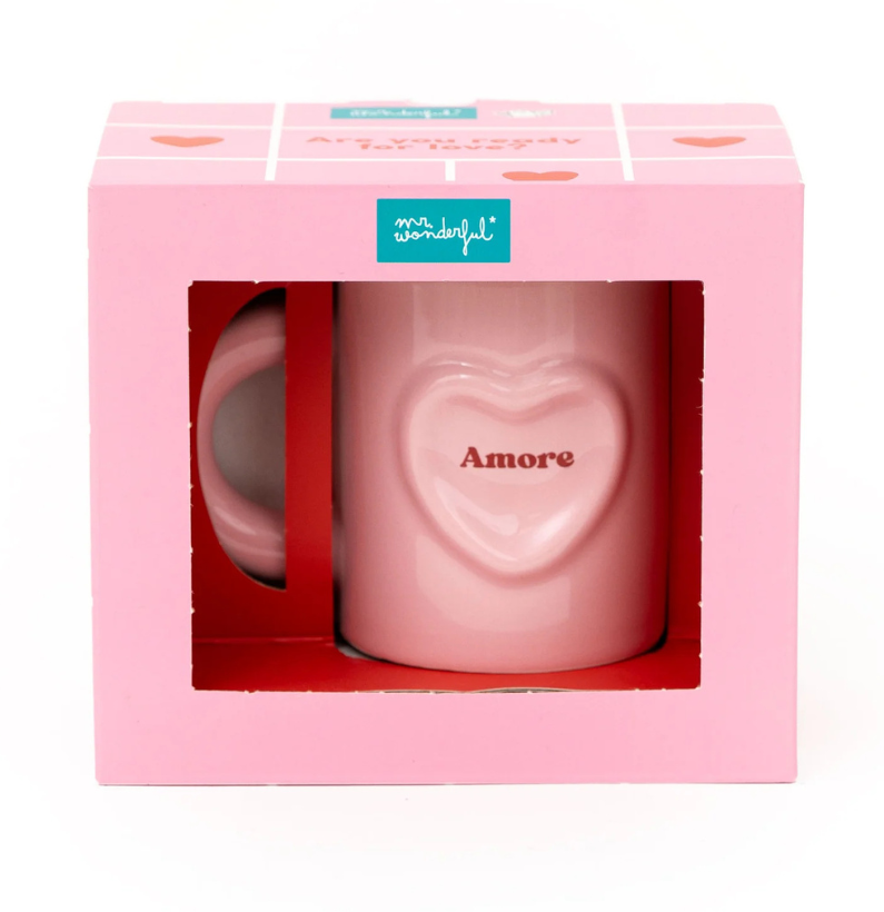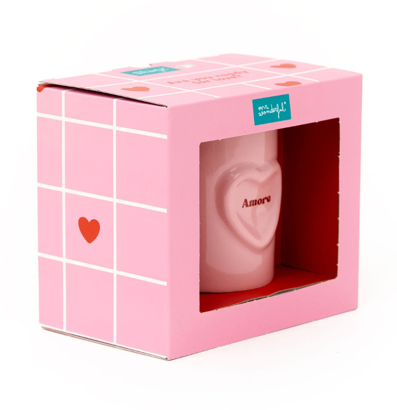 A Caneca 3D Mr. Wonderful Amore é perfeita para oferecer à tua pessoa especial. Fabricada em cerâmica e com um encantador design 3D, transmite uma mensagem cheia de amor e boa disposição. Ideal para café, chá ou chocolate quente, transforma cada momento numa pausa mais feliz. Pode ir ao micro-ondas e à máquina de lavar louça, embora se recomende a lavagem à mão para preservar o design por mais tempo.