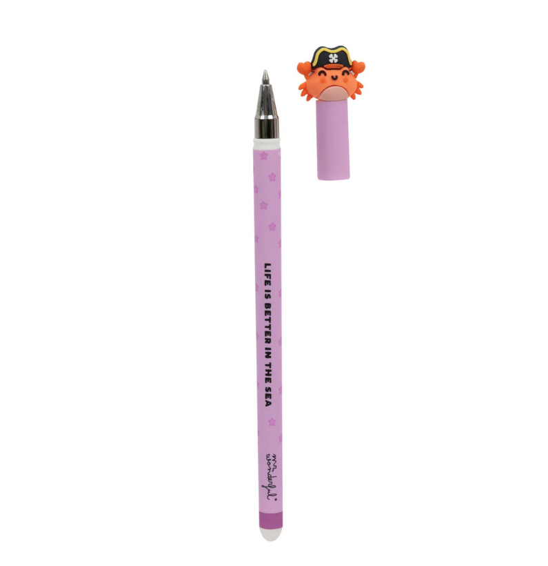Neste modelo, encontras um caranguejo pirata super irreverente numa das pontas, pronto para zarpar em novas aventuras contigo! No outro extremo, está a borracha mágica — feita especialmente para apagar a tinta lilás desta caneta. Mas atenção: só esta borracha funciona! Com qualquer outra, o que escreveste ficará… para sempre nos teus mapas do tesouro!