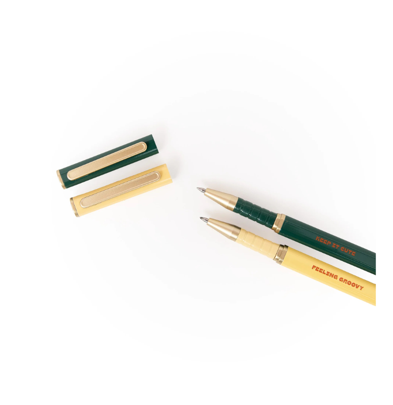 Com corpo metálico resistente, escrita suave e mensagens inspiradoras — “Keep it cute” e “Feeling groovy” — estas canetas tornam cada nota divertida e motivadora.