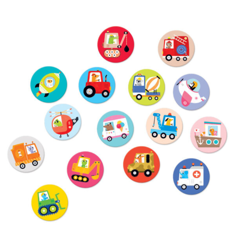 As peças apresentam veículos coloridos e motoristas atarefados que captam imediatamente a atenção das crianças. Desde escavadoras e camiões até carros e tratores, cada imagem é uma nova oportunidade para estimular a memória, a concentração e a linguagem.