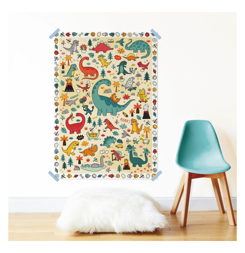 A dinâmica é simples e intuitiva: basta desdobrar o cartaz e começar a colar os adesivos nos lugares desejados. Para quem precisa de orientação, é fornecido um modelo na bolsa, mas a verdadeira diversão está em criar livremente e decidir a disposição dos dinossauros, permitindo que cada póster seja totalmente personalizado. Esta atividade promove a coordenação motora fina, a criatividade, a concentração e a capacidade de planeamento, tudo enquanto a criança se diverte a inventar aventuras no mundo dos dinossauros.