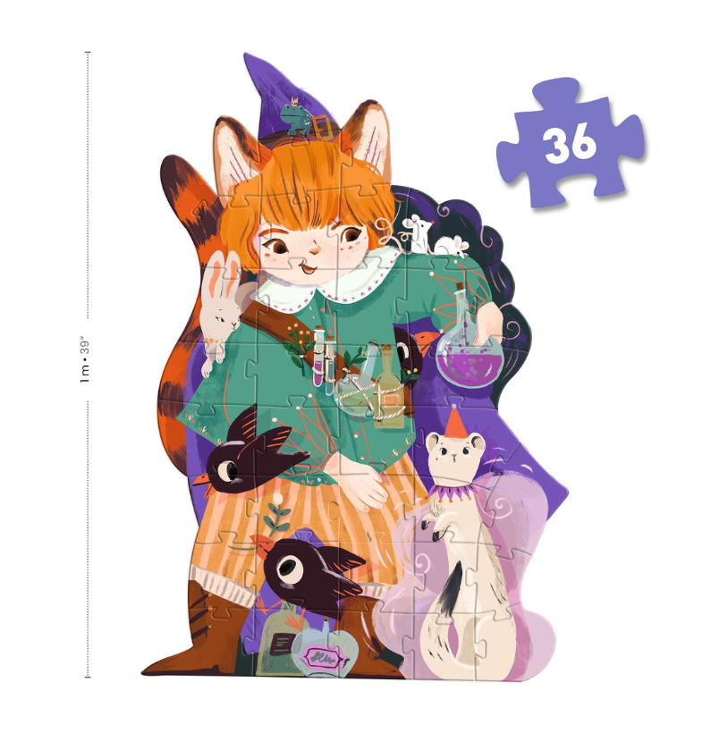 Com uma forma fora do comum, o puzzle tem uma borda recortada em silhueta, tornando a montagem ainda mais desafiadora e divertida. À medida que as peças se encaixam, surgem criaturas encantadas, poções borbulhantes, vassouras voadoras e muitas travessuras mágicas criadas por esse mago maluco.