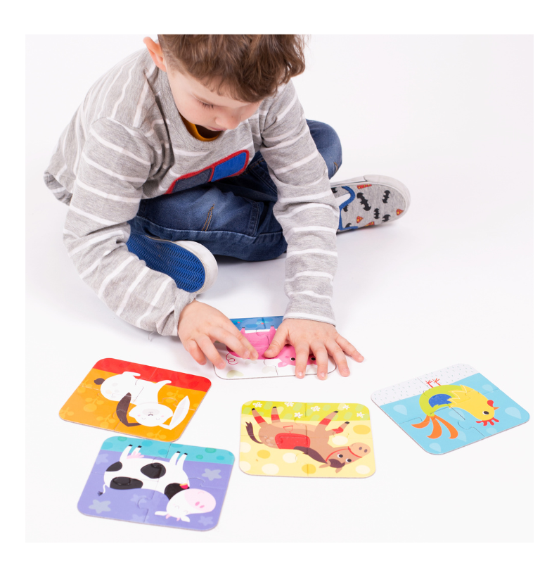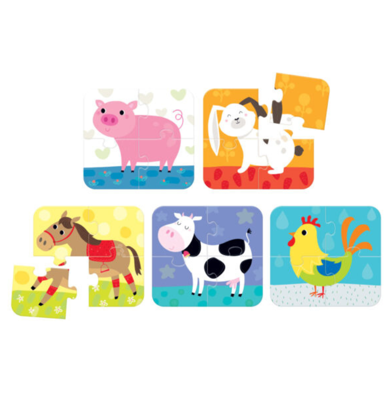 O conjunto inclui 4 puzzles coloridos e resistentes, cada um com 4 peças grandes, perfeitas para mãos pequenas. Cada quebra-cabeça revela um simpático animal da quinta — vacas, porcos, ovelhas e outros companheiros adoráveis esperam ser descobertos peça a peça!