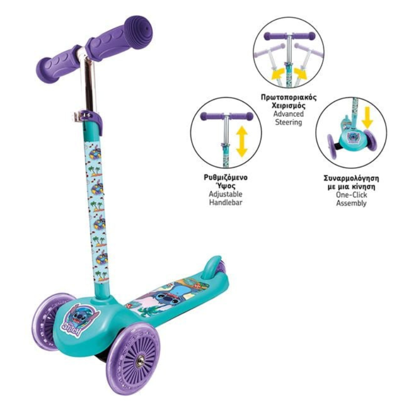 Stitch Trotinete Twist & Roll com 3 Rodas é ideal para crianças pequenas que estão a aprender a andar de trotinete. Combinando segurança, conforto e um design irresistível, é o presente perfeito para incentivar os mais pequenos a explorar o mundo ao seu ritmo… e com muito estilo!