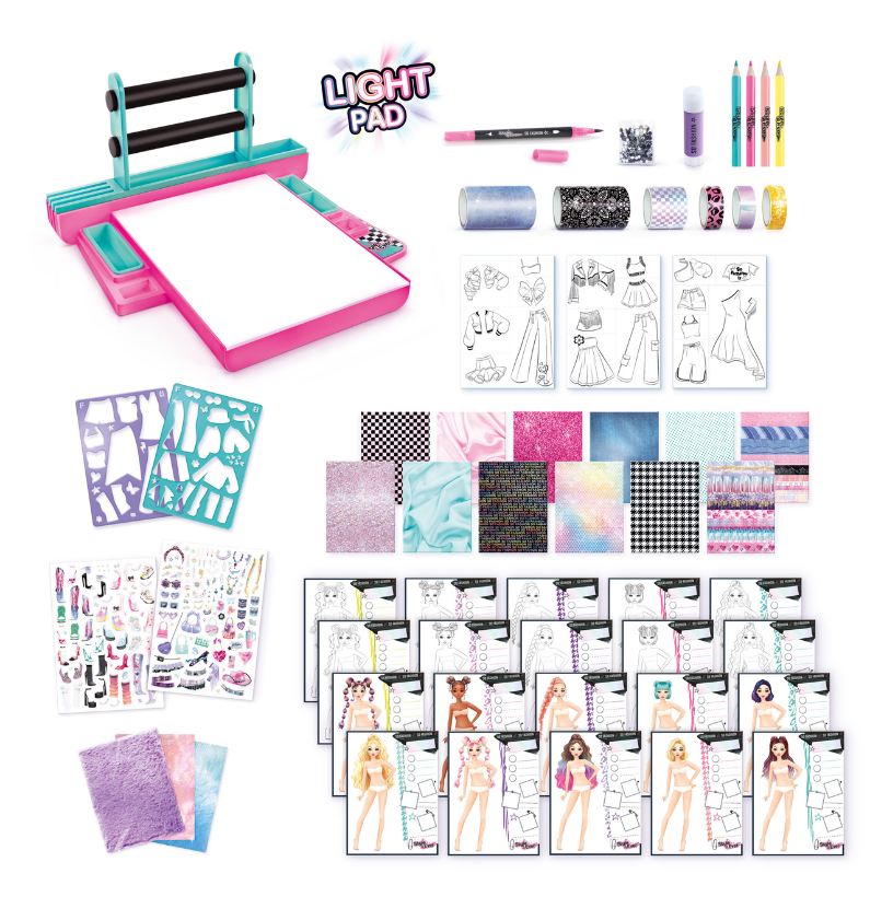 Com a sua função de luz de fundo integrada, este estúdio permite esboçar, traçar e criar designs com precisão e facilidade. A iluminação ajuda a ver cada detalhe dos teus desenhos, tornando o processo de criação ainda mais mágico e profissional — como se estivesses num verdadeiro ateliê de moda!